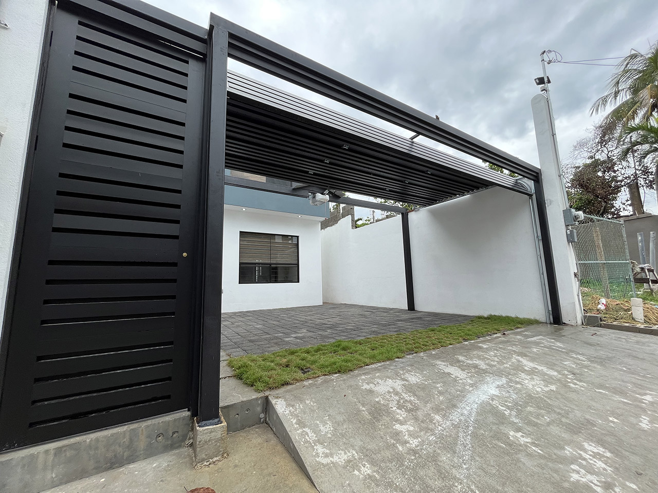 • Fabricación de portón ascendente en aluminio bronce oscuro, puerta peatonal batiente, portería con estructura de herrería para soporte con sistema de automatización.