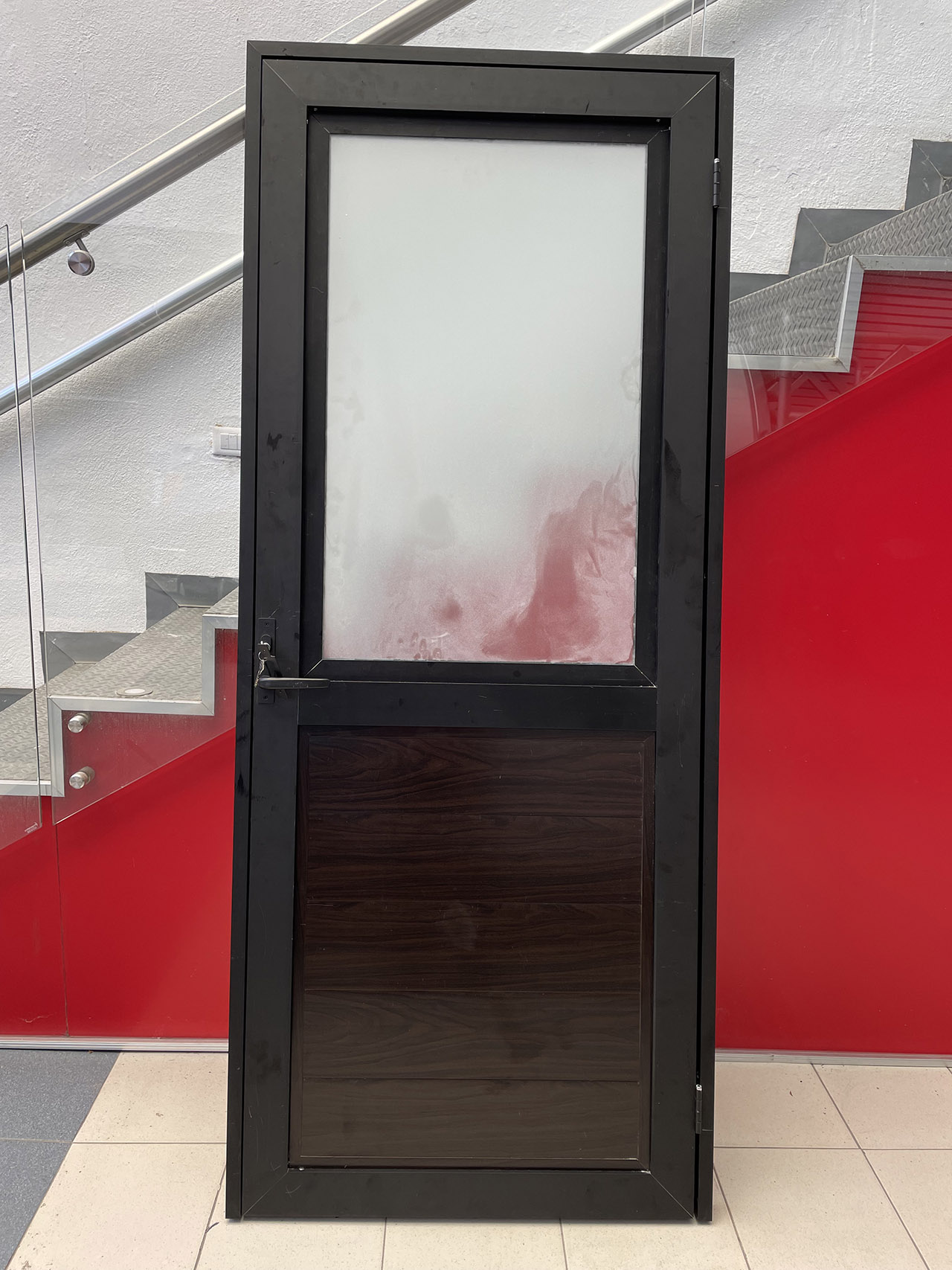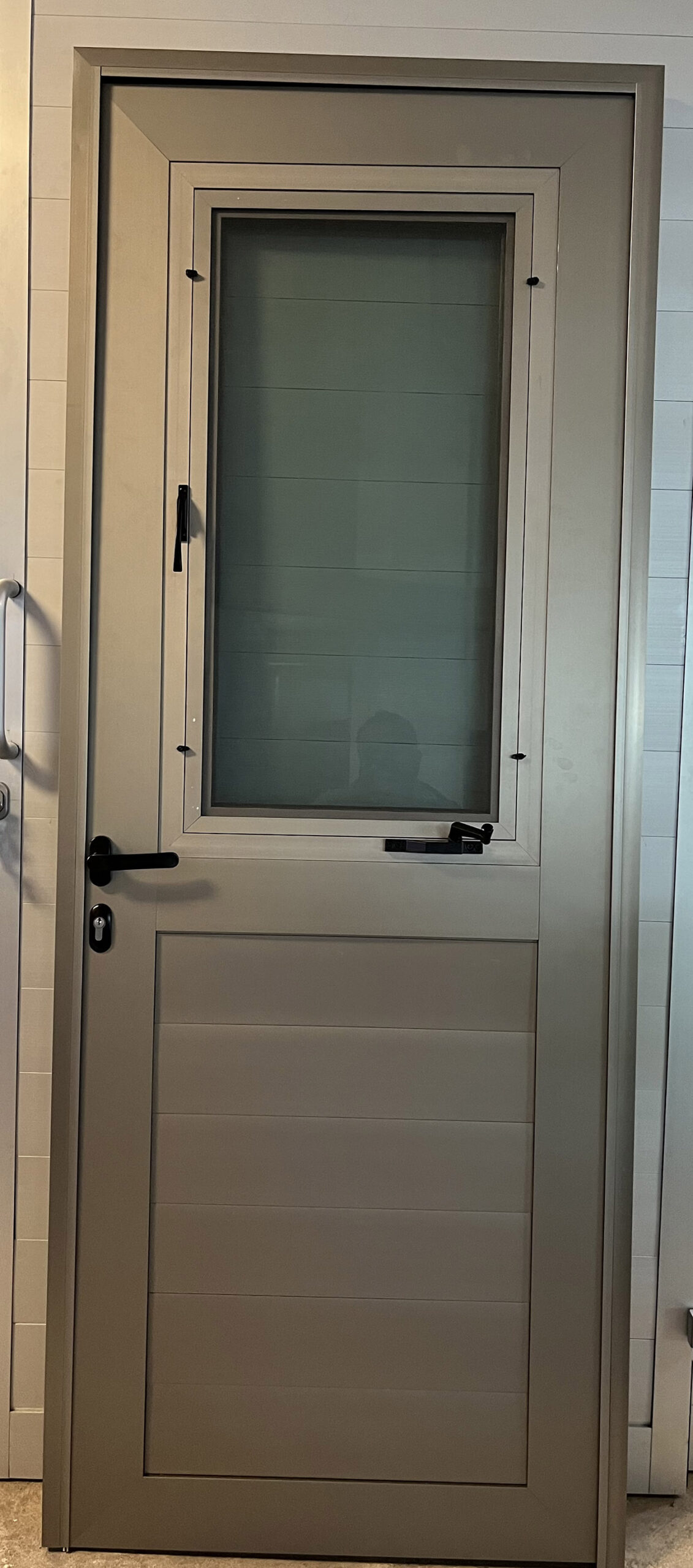 • Puerta en aluminio bronce oscuro con medio tablero interior de PVC chocolate y cristal esmerilado superior.