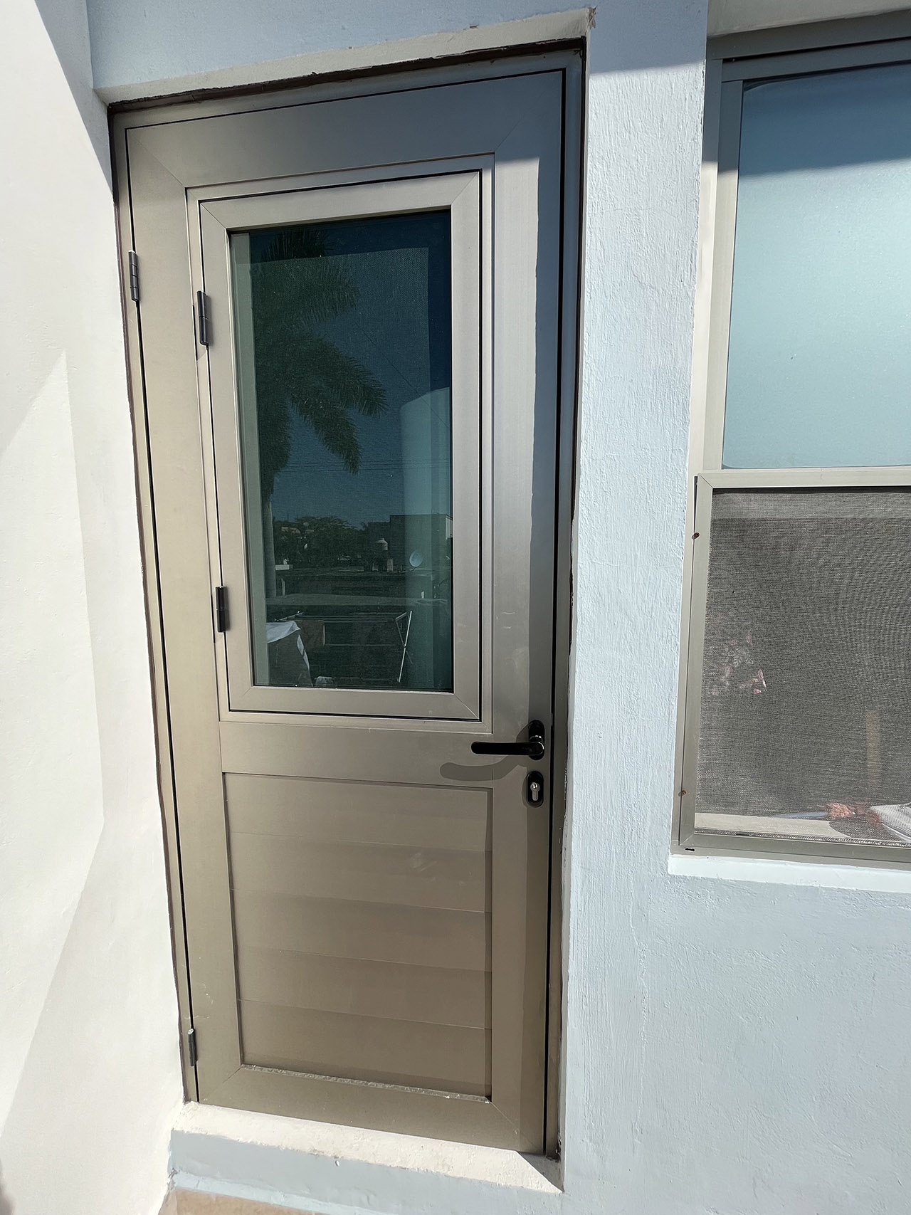 • Puerta estilo residencial con hoja abatible interior en champagne brillante.