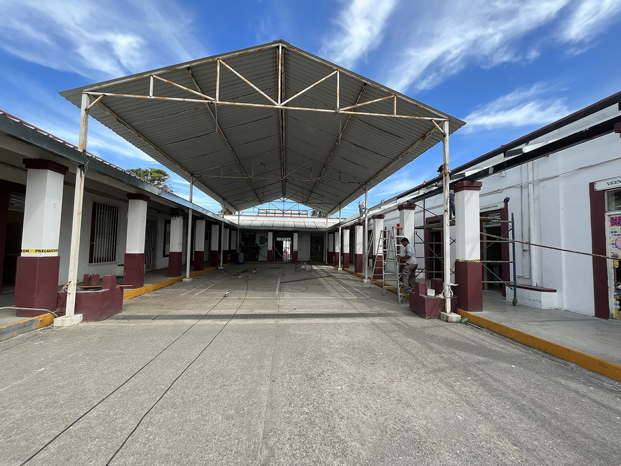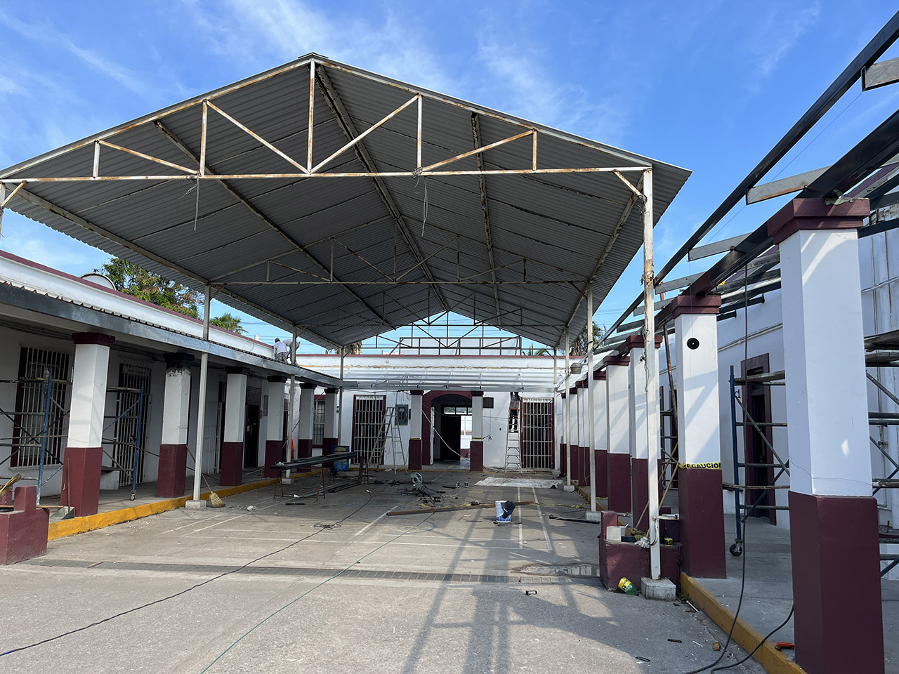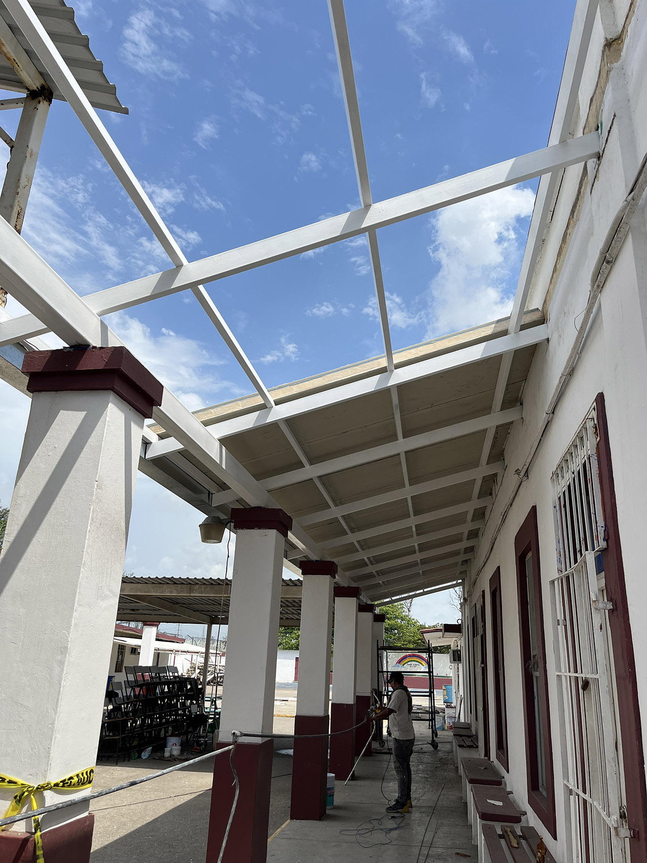 Suministro y armado de estructura a base de montenes de herrería, anclados con cargadores, soldadura, fondo estructural y pintura en esmalte acrílico blanco, reinstalación de lámina tipo multipanel con canalones para descargar pluvial, tornillería hexagonal nueva, instalaciones eléctricas, voz y datos.